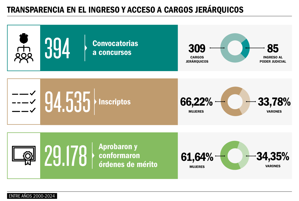 Por otra parte, para el acceso a cargos jerárquicos (concursos cerrados de títulos, antecedentes y exámenes), el personal es llamado a rendir exámenes para cubrir una vacante. En este caso, el listado de orden de mérito se confecciona a partir de los resultados de la evaluación, junto al puntaje obtenido por antecedentes de capacitación, títulos, antigüedad y funciones en el Poder Judicial.